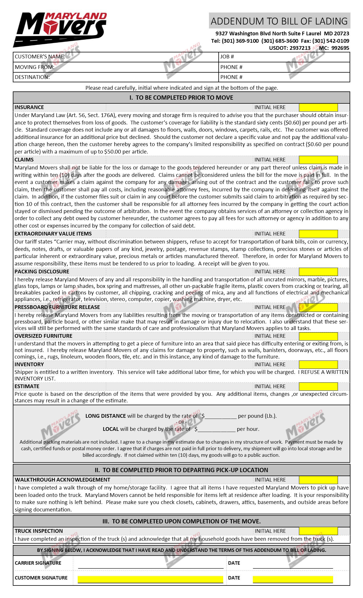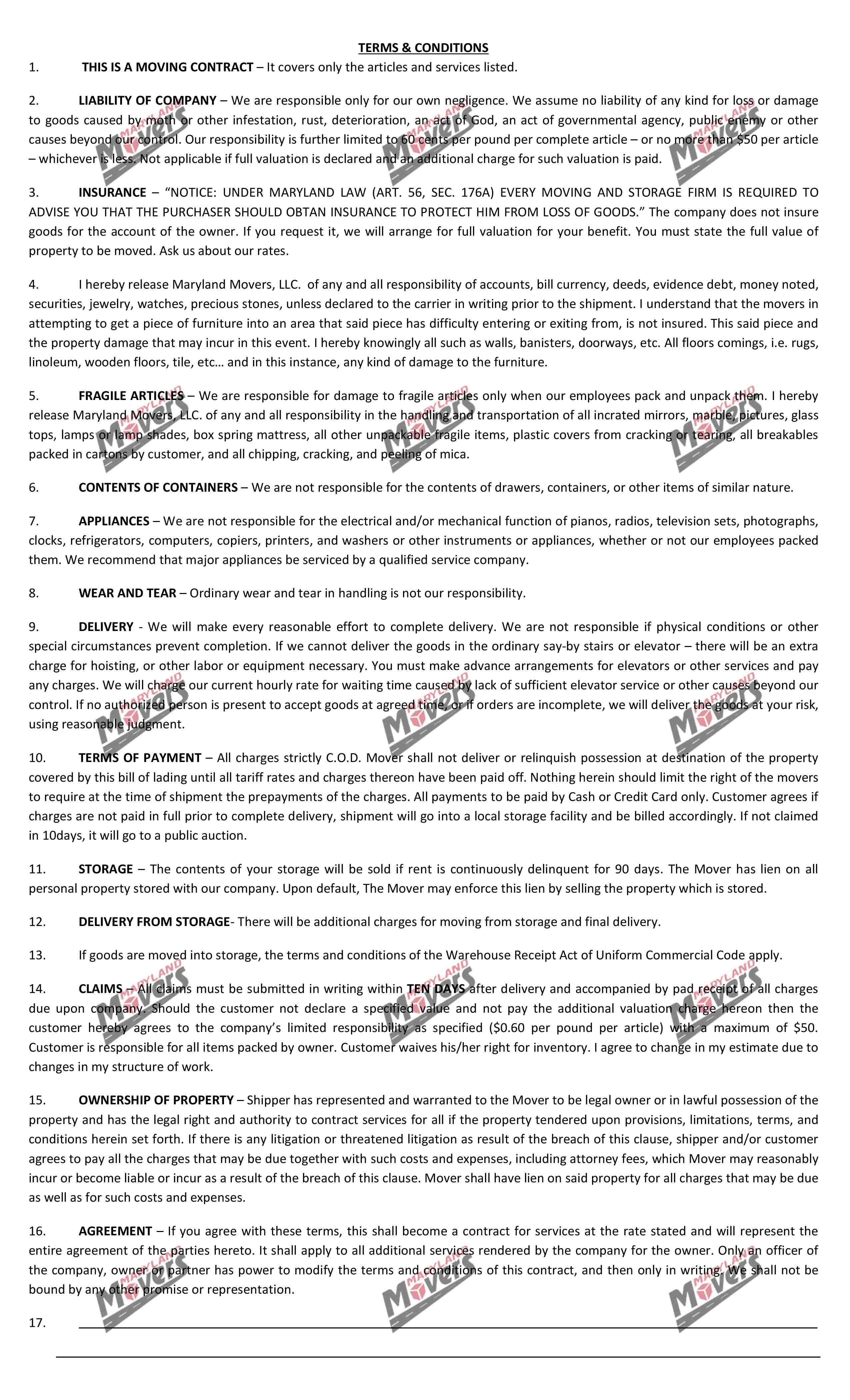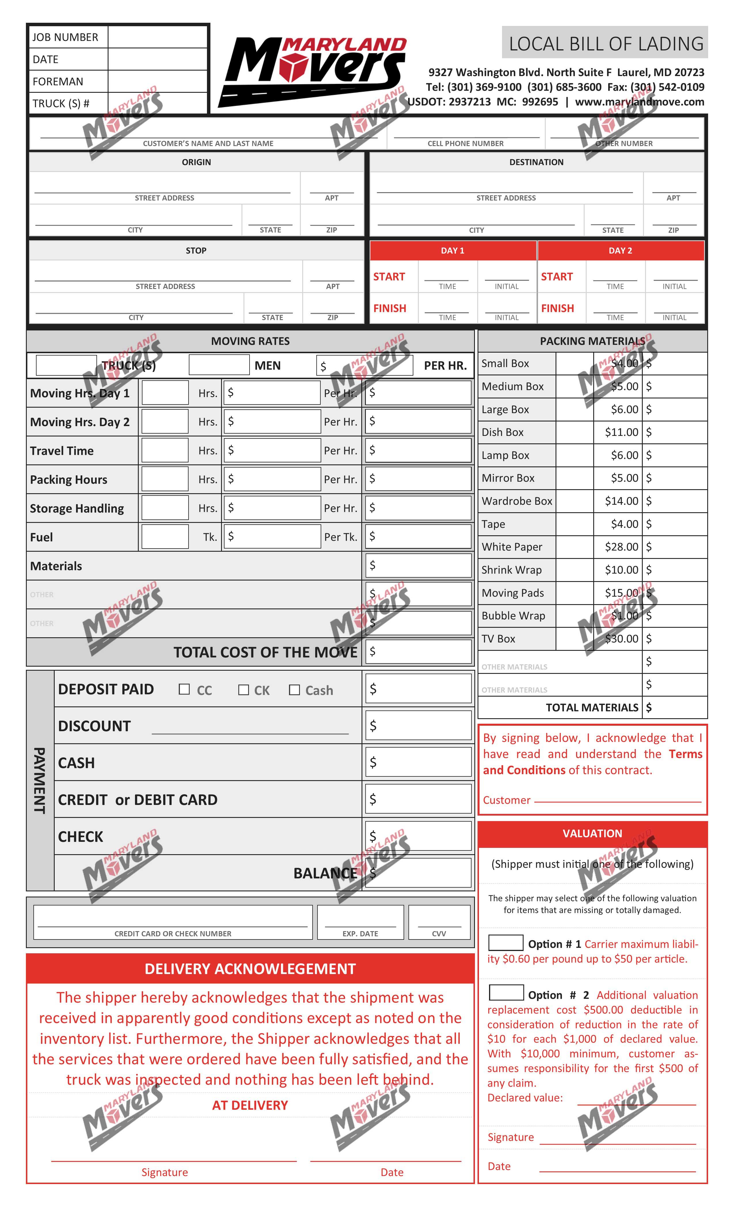 Here at Maryland Movers we know you have questions and concerns about the documents you will need to sign for your move. From the initial Service Agreement to our Local or Long Distance Contracts.